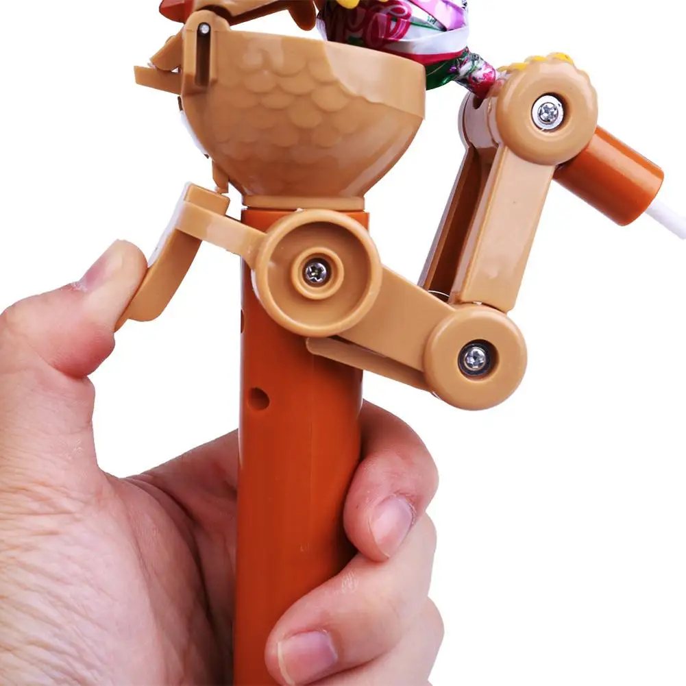 Product play: Press and hold the switch (like the pic shows) to extend the arm of the robot, place the lollipop at the arm; push the switch candy will be automatically stored in the robot.